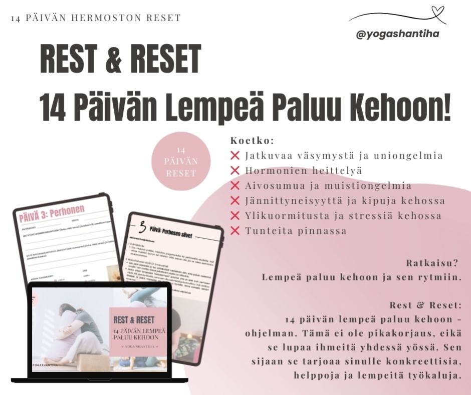 Rest & Reset on 14 päivän mittainen online-ohjelma, joka on suunniteltu auttamaan sinua syvään palautumiseen ja stressin purkamiseen. Ohjelma tarjoaa päivittäisiä, helppoja (1-5 min) ja lempeitä harjoituksia, kuten hengitystekniikoita, somaattisia liikkeitä, akupisteiden stimulointia ja rentoutumisharjoituksia. Saat joka päivä uuden video-ohjeistuksen ja tukevan sähköpostin, sekä käyttöösi kattavan workbookin ja jatkokalenterin. Tavoitteena on rauhoittaa hermostoa, vapauttaa kehon jännityksiä ja parantaa unenlaatua.